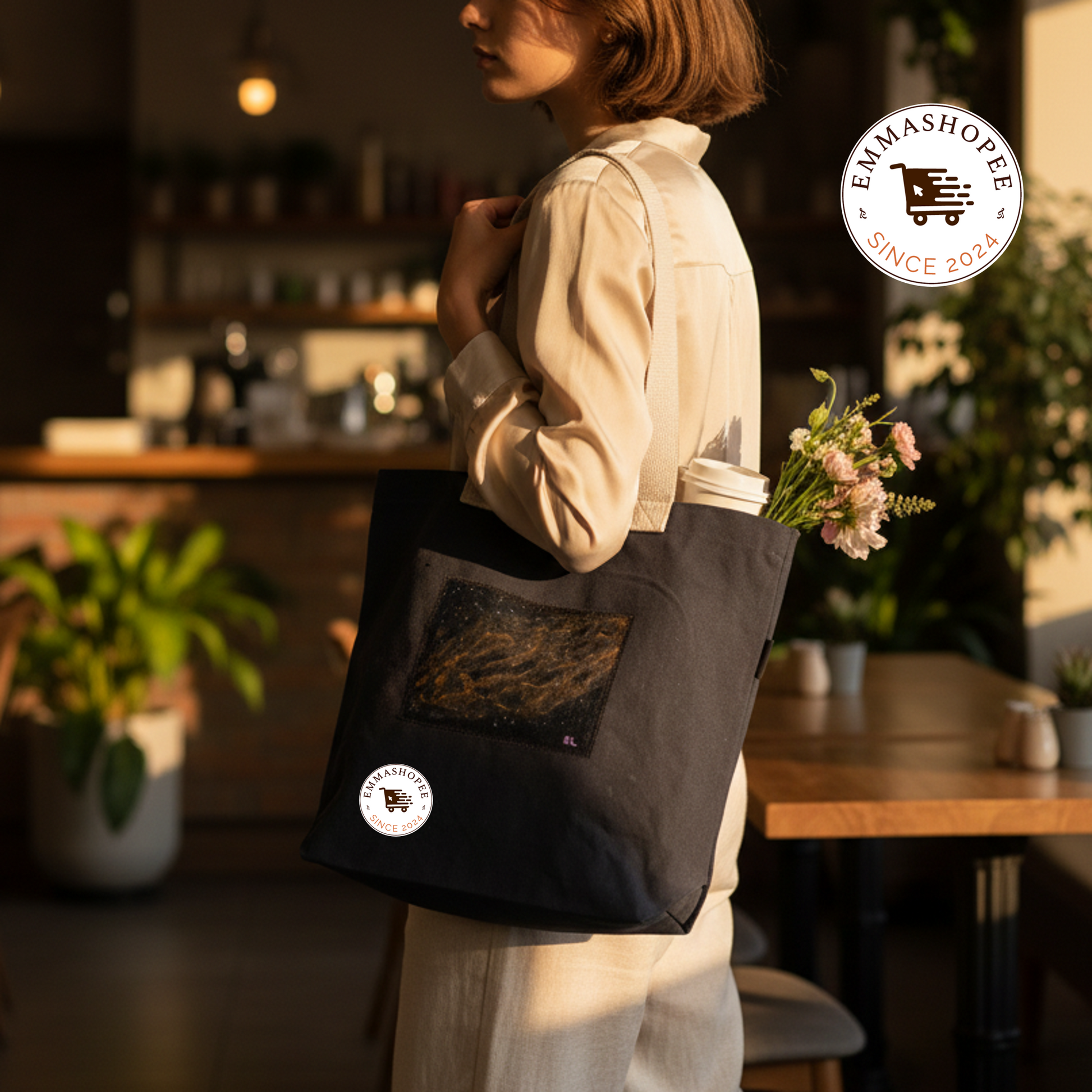 The California Nebula tote, one of the kind pieces, represents a thoughtful synthesis of ecological responsibility and cultivated taste. Constructed from sustainable recycled canvas in pure cotton, each piece bears a distinctive hand-painted charcoal motif that celebrates artisanal craftsmanship. It's precisely proportioned frame—14" x 13" x 3"—balances practical functionality with visual restraint, accommodating daily essentials while preserving an air of understated sophistication. An ideal accessory for the discerning individual, it navigates effortlessly across professional and leisure contexts, affirming a commitment to both aesthetic excellence and environmental consciousness.