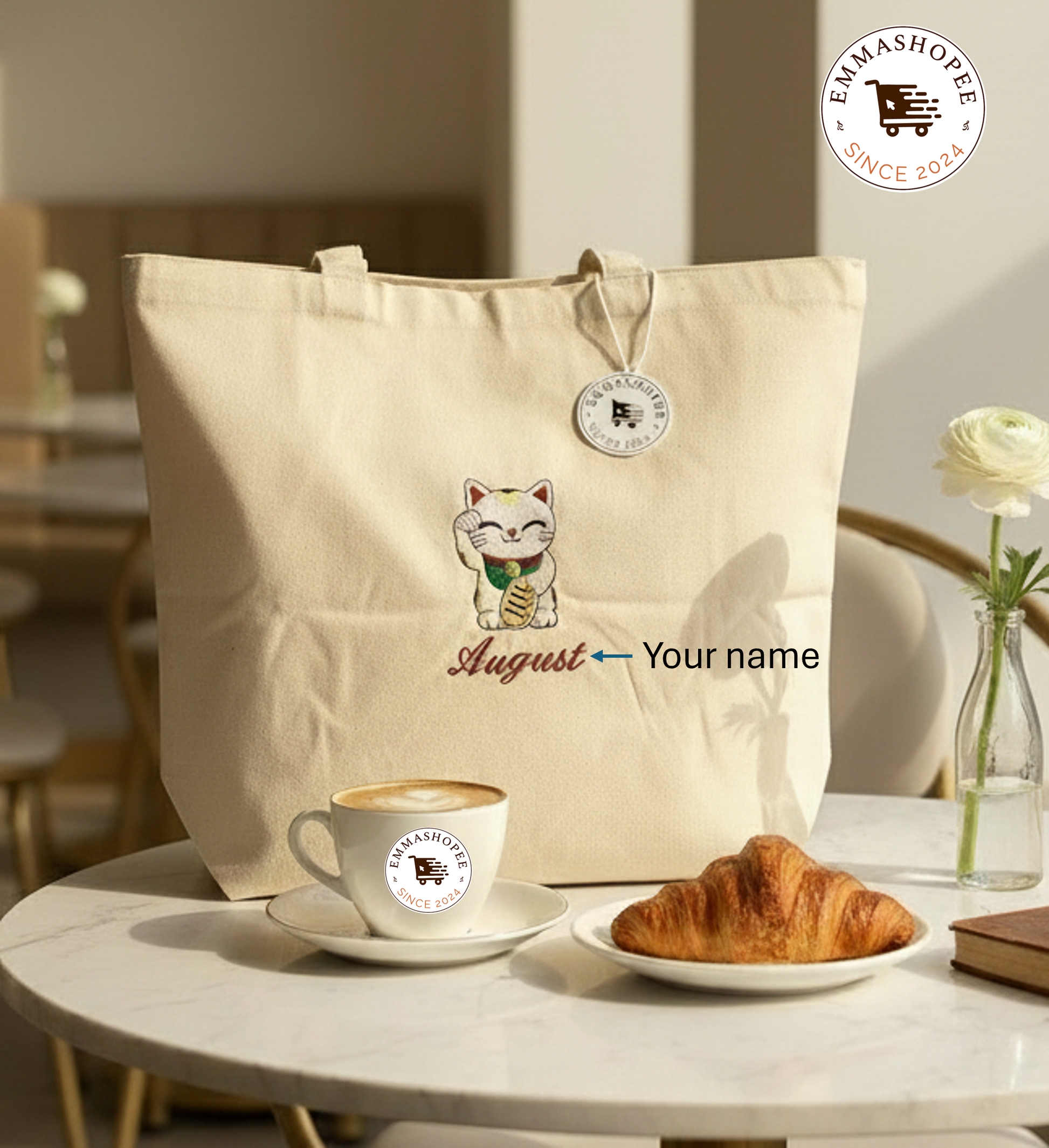 Carry a little luck wherever you go with the Custom Embroidery “My Lucky Cat” tote bag! Crafted from sturdy 100% cotton canvas, this 15 by 16-inch tote with a comfy 22-inch handle is perfect for your daily adventures. Make it truly yours by adding your name or initial (3-5 Characters) in playful embroidery alongside the cheerful lucky cat—because who says practicality can’t be fun? Tote it, show it off, and let the good vibes follow you everywhere!